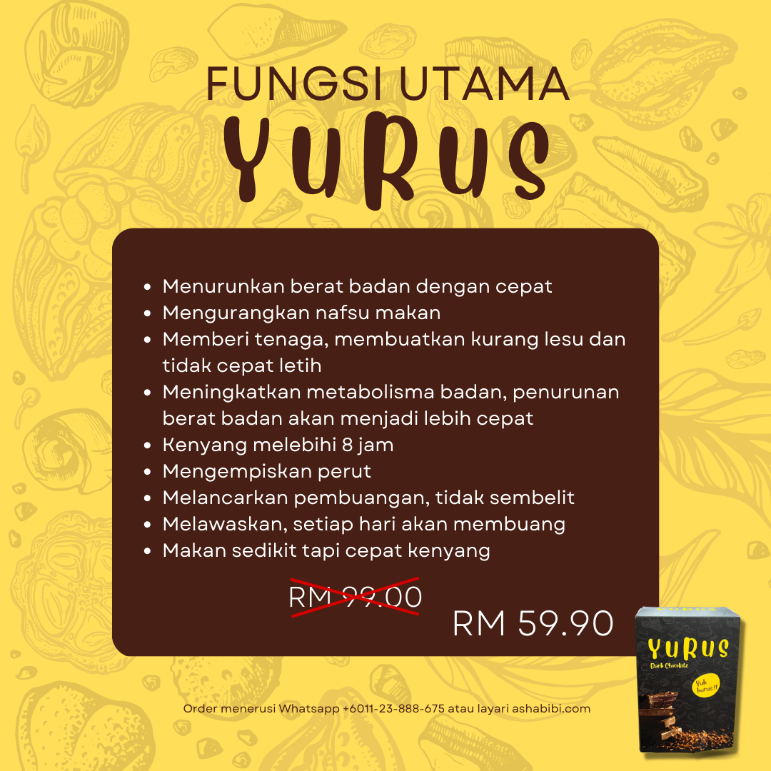 Yurus dapat membantu anda untuk menurunkan berat badan dengan efektif kerana Yurus menggunakan konsep defisit kalori di mana apabila anda mengambil 1 sachet Yurus Dark Chocolate di pagi hari 5 minum sebelum makan sarapan, anda akan berasa kenyang dengan kadar yang sangat cepat dan lama (8-10 jam). Ini secara tidak langsung membuatkan pengambilan kalori harian anda berkurang dan penurunan berat badan akan terjadi apabila pengambilan kalori harian kita berkurang.